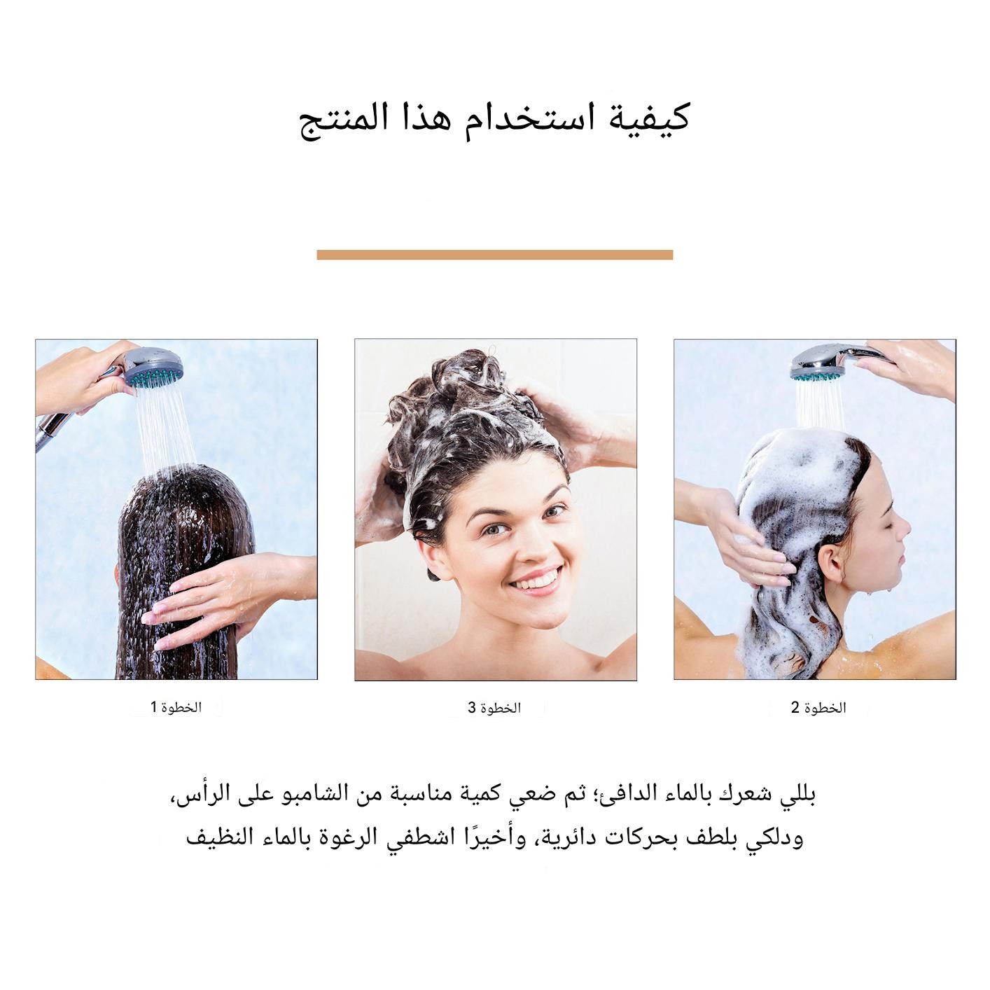 أثناء الاستحمام، بللي شعرك بالماء الدافئ، ضعي الشامبو، ودلكي فروة الرأس لمدة 1-2 دقيقة، ثم اشطفيه جيدًا للاستمتاع بشعر منعش ومنعش